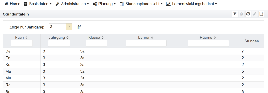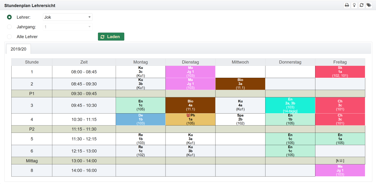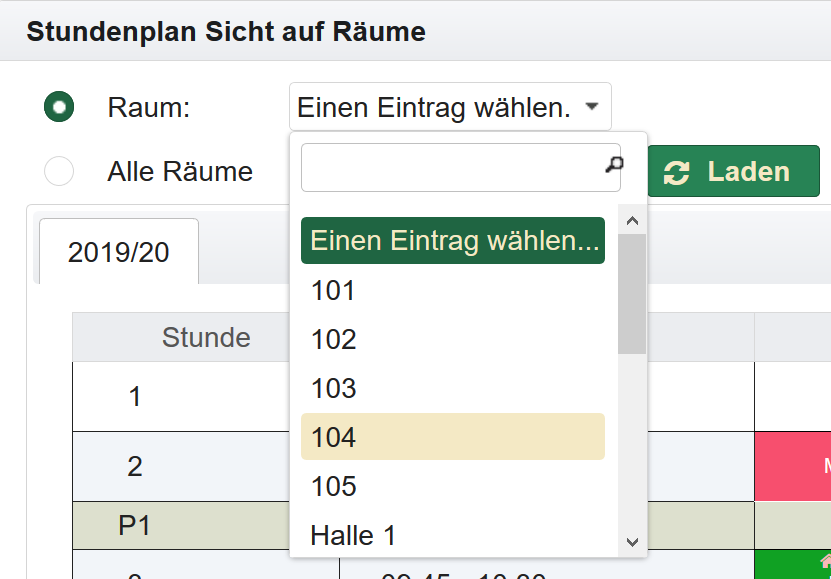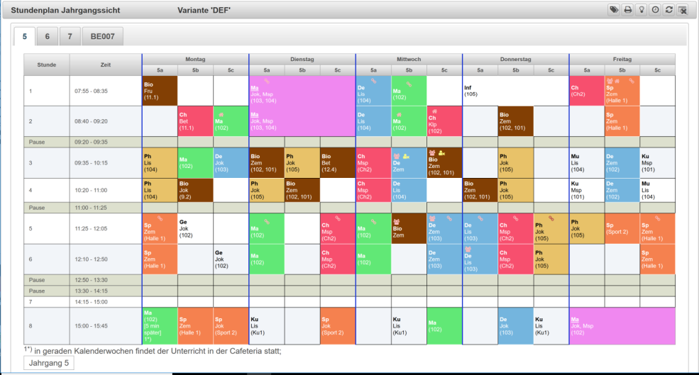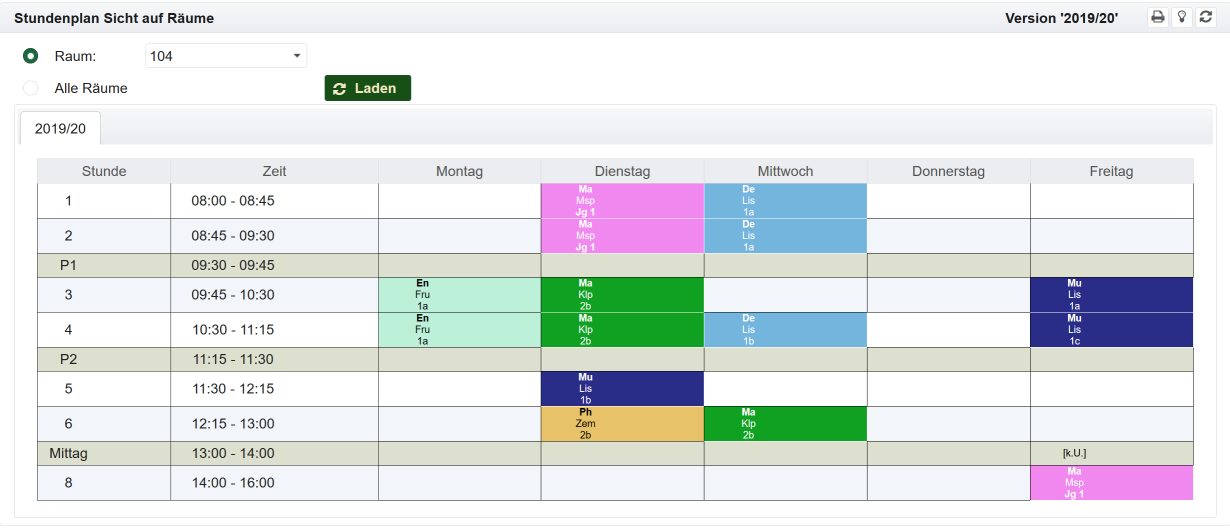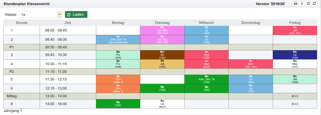 Die Bedienung der Ansichten für Klassen, Lehrer oder Räume erfolgt im Wesentlichen gleich. Im Folgenden wird es am Beispiel der Ansicht für eine Klasse erläutert.