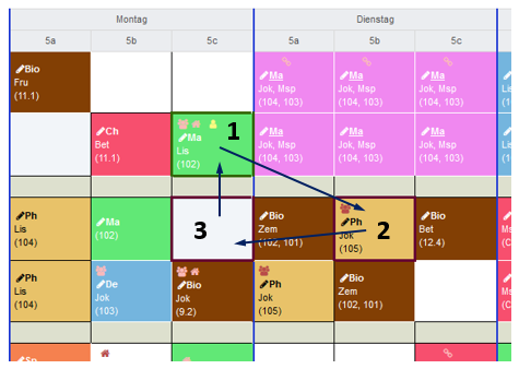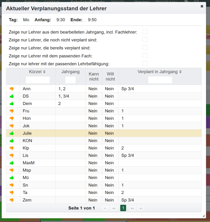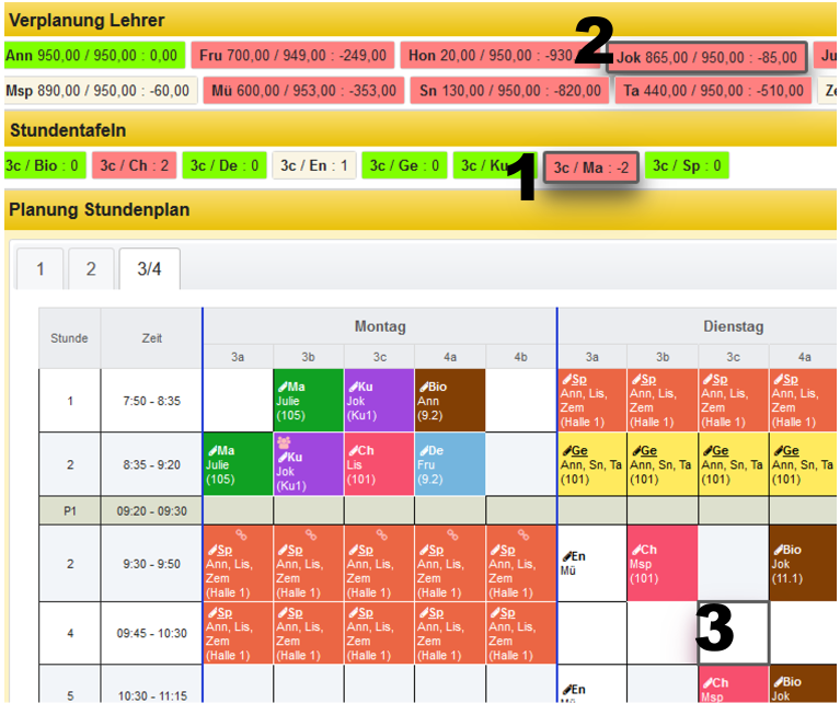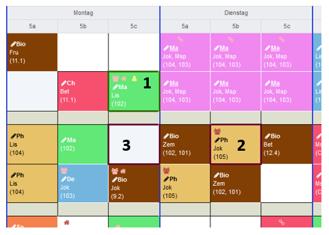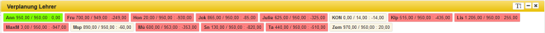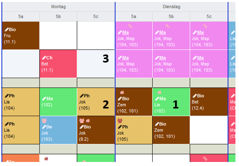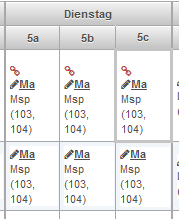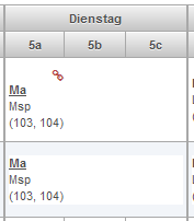 - Ein Lehrer ist nicht verfügbar. Es sind jedoch mehrere Lehrer für diese Unterrichtseinheit zugeteilt. Im Tooltip wird die Liste der zugewiesenenen Lehrerkürzel aufgeführt. Je nachdem, wie die Einstellungen vorgenommen wurden, werden Doppelbelegungen angezeigt oder auch ausgeblendet, solange mindestens eine Ressource verfügbar ist.