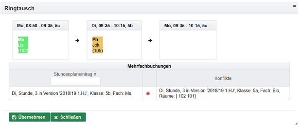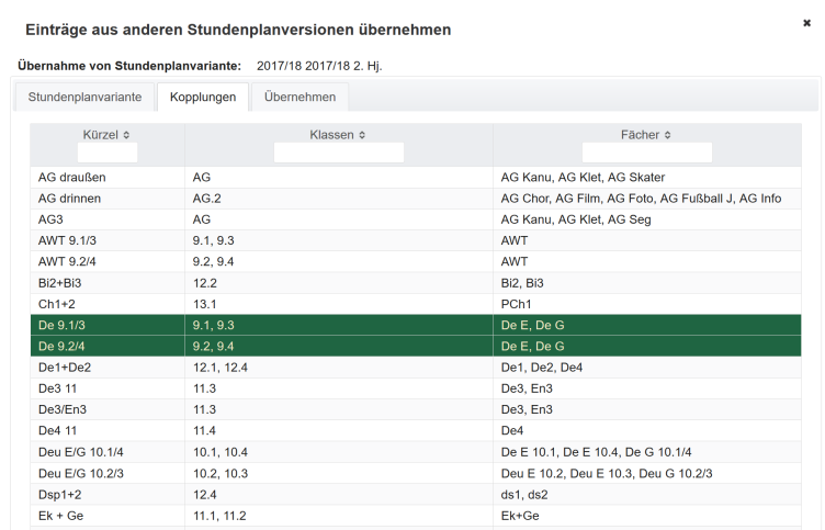 - eine Klasse ist nicht verfügbar | Klasse | Liste der betroffenen Klassen | Fach | betroffenes Fach | Tag | Tag, an dem sich das Ereignis auswirkt | Stunden | Stunde oder Pause zu dem sich das Ereignis auswirkt | Von/Bis | Zeitspanne für die die Stunde/Pause geplant ist | Status | Status der Bearbeitung