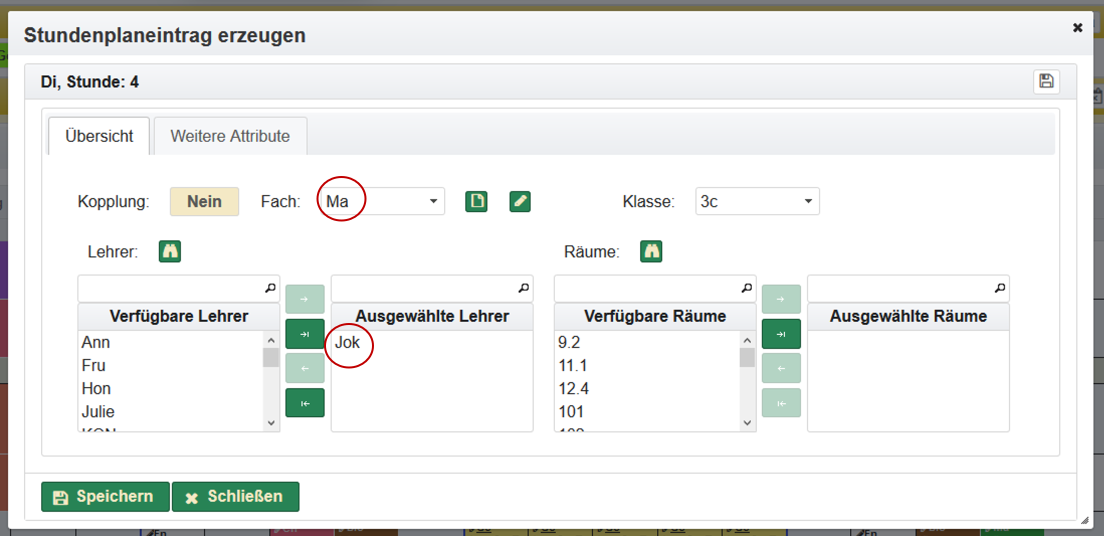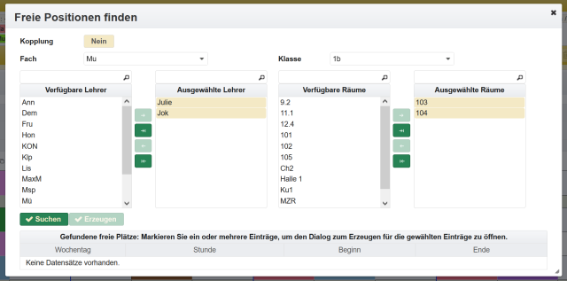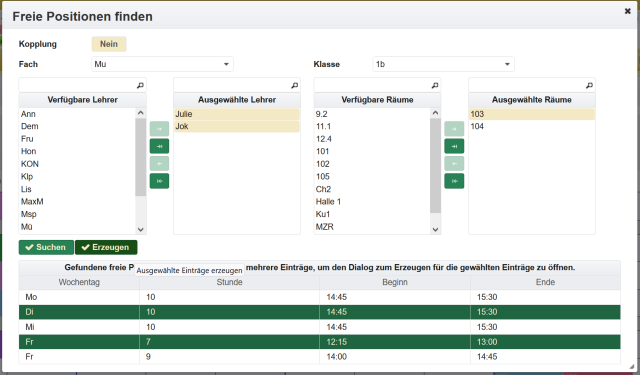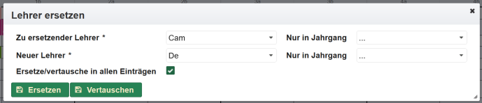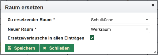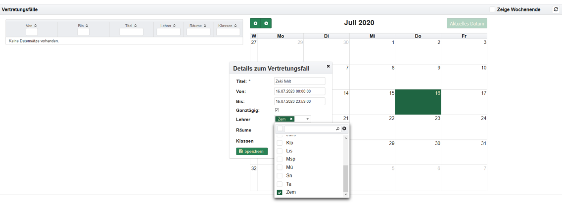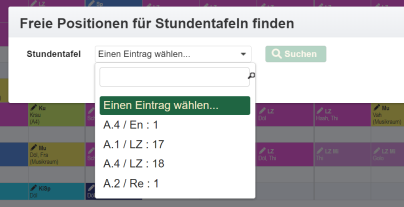 Die Einträge für Vertretungsstunden lassen sich im Abschnitt Vertretungsstunden auch direkt über erzeugen. Es öffnet sich ein Dialog für die Auswahl des Zeitplaneintrages.
