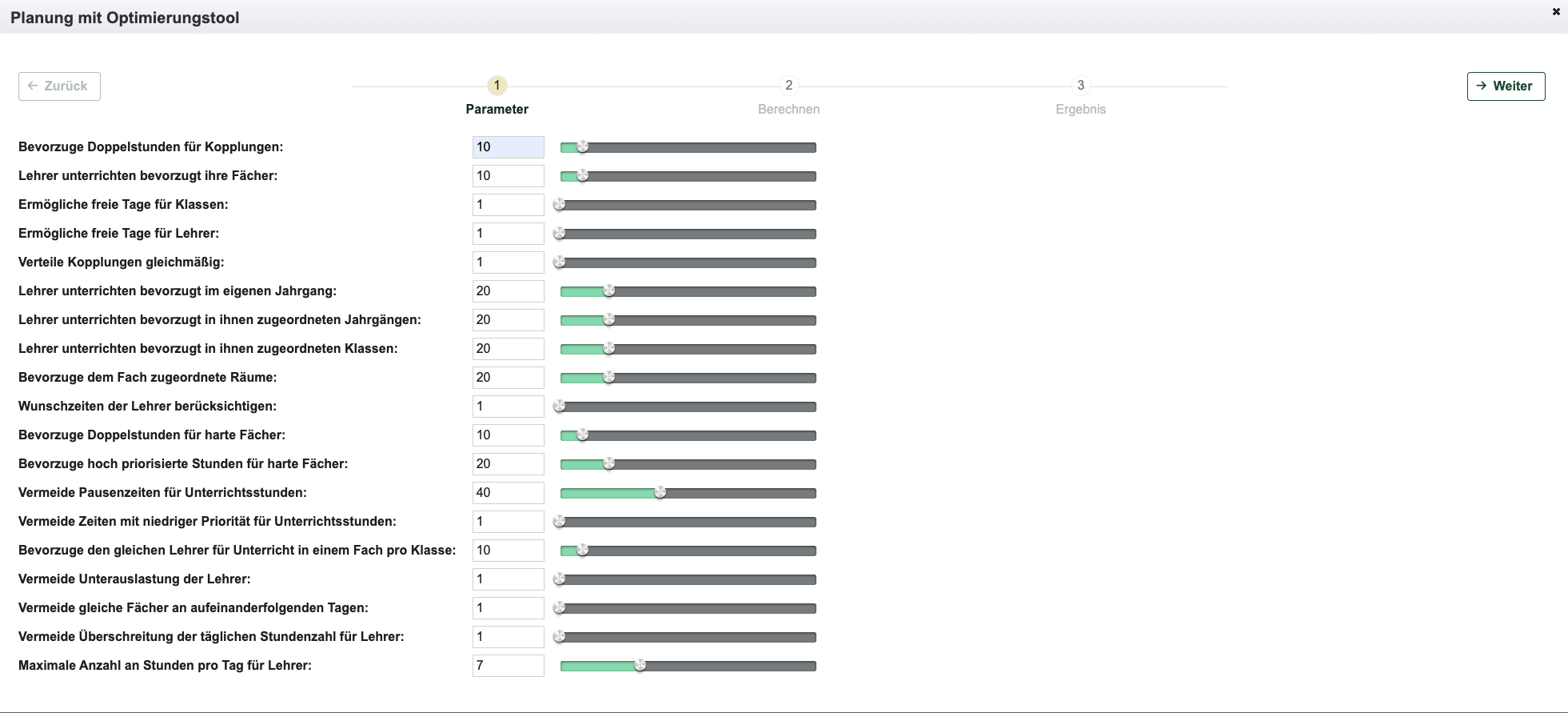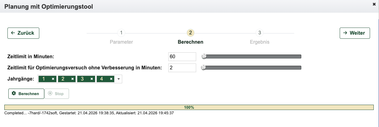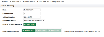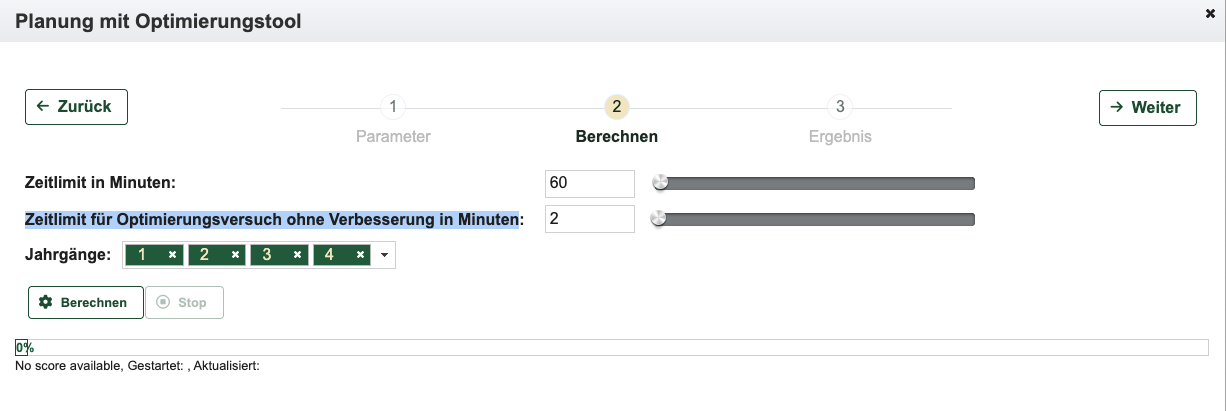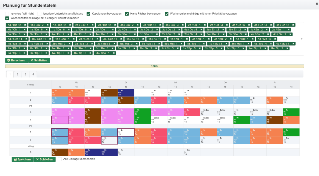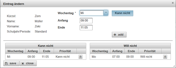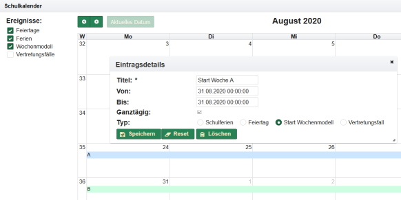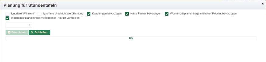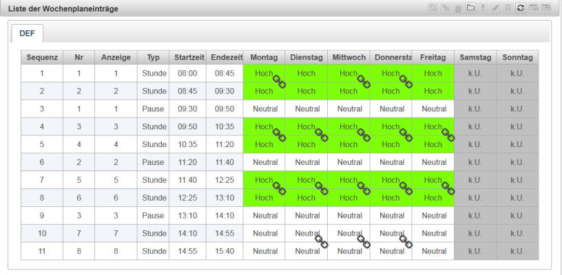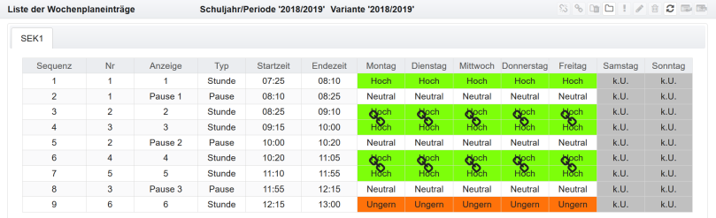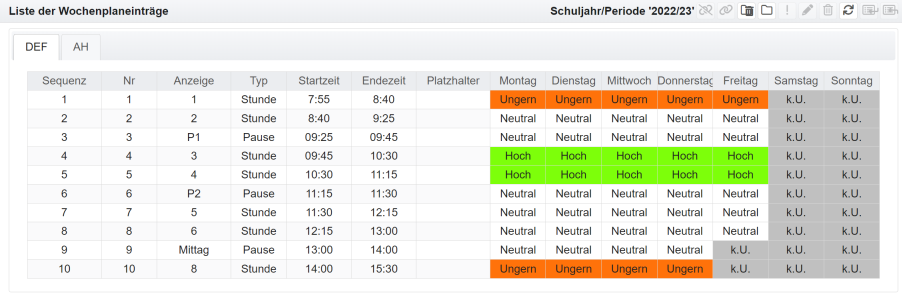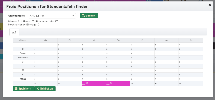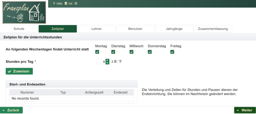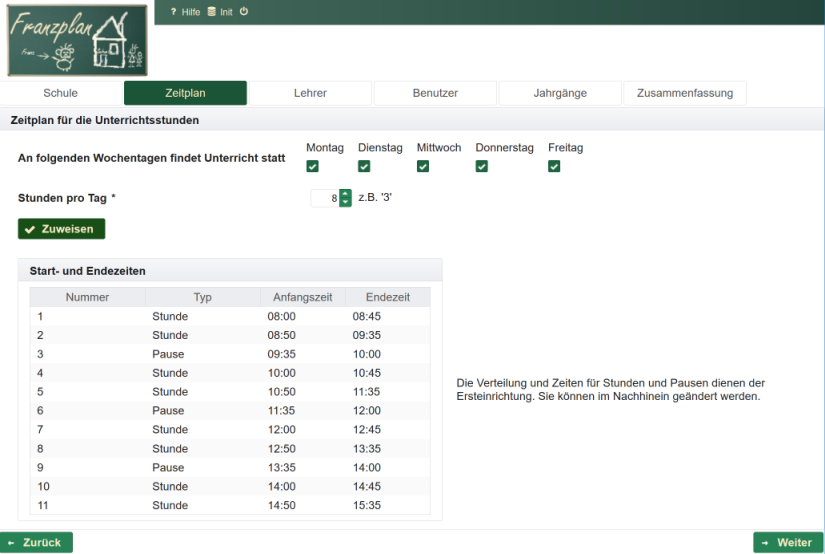 Im Zeitplan können die Tage festgelegt werden, an denen in der Regel unterrichtet wird und ebenso die Anzahl der Stunden (maximale Anzahl pro Tag).