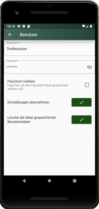 Es gibt die Möglichkeit, den Benutzernamen und das Passwort im lokalen Bereich auf dem Smartphone/dem Tablet zu speichern, damit diese Daten nicht jedesmal neu eingegeben werden müssen.