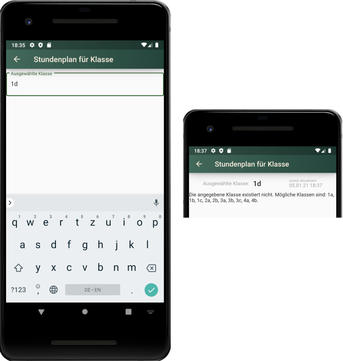 Wenn noch nie ein Stundenplan abgerufen wurde, wird zunächst nach der gewünschten Klasse (dem Lehrer oder Raum) gefragt. Sollte die eingegebene Klasse (der Raum oder der Lehrer) nicht existieren, erfolgt eine Meldung mit Vorschlägen, welche Klassen passen könnten.