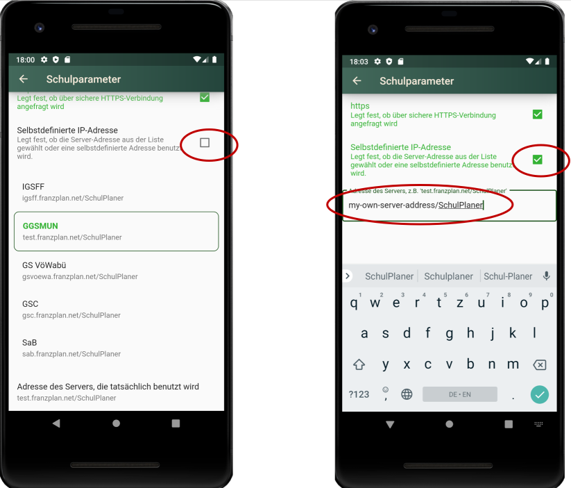 Hier kann die Adresse des Schulservers aus der Liste der vorhandenen Einträge direkt ausgewählt werden. Wenn der Schulserver in der Liste nicht vorhanden ist, besteht die Möglichkeit, die Adresse manuell einzugeben. Dazu wird der Haken bei Selbstdefinierte IP-Adresse gesetzt und das Textfeld Adresse des Servers, die tatsächlich benutzt wird entsprechend angepasst.
