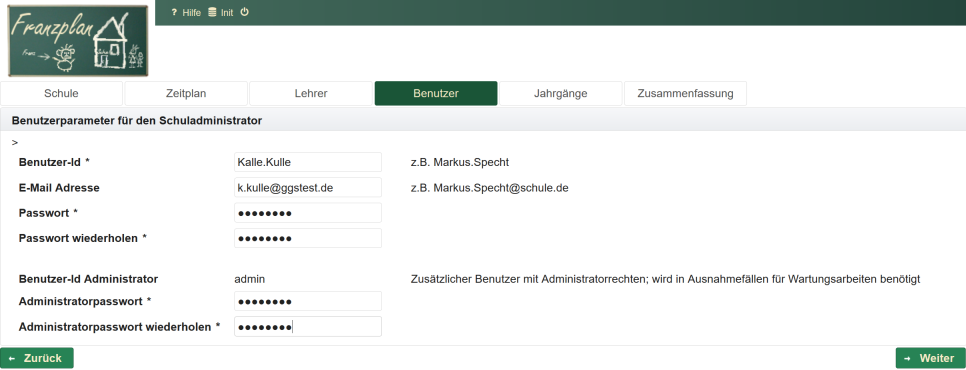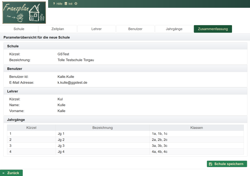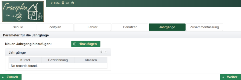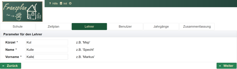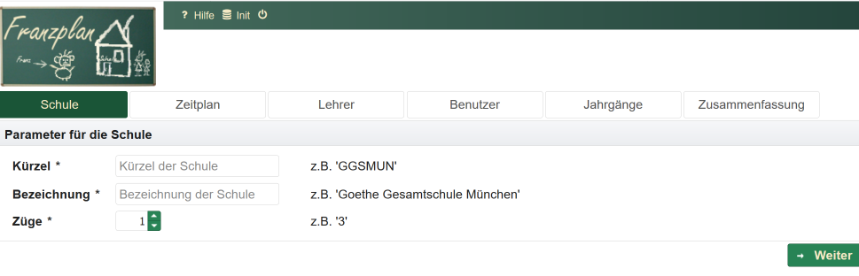 Sie werden jetzt Schritt für Schritt durch die Ersteinrichtung zur Vornahme der Grundeinstellungen für die Schule geführt. Solche Grundeinstellungen sind z.B. Schulname, Benutzer, Zeitplan, Lehrer, Jahrgänge, Fächer und Klassen. Alle Daten, die Sie hier eingeben, können später auch wieder geändert werden. Sie sind aber nötig, damit die Arbeit mit dem Franzplan überhaupt losgehen kann. Die Einrichtung erfolgt in den folgenden Schritten: