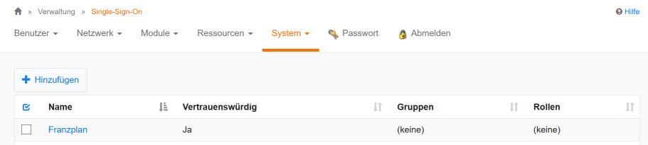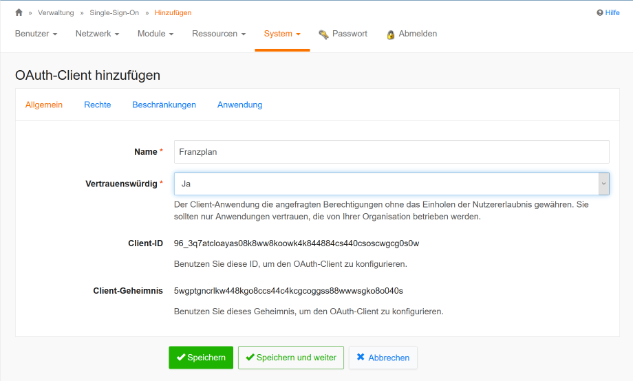 Im IServ benötigt man Administrator-Rechte, damit die Konfiguration von Single Sign On (SSO) ausgeführt werden kann. Dazu wird unter Verwaltung der Menüpunkt System und hier wiederum Single-Sign-On ausgewählt. Durch Klicken auf den Button + Hinzufügen kann man einen neuen Eintrag für den Franzplan erstellen. Vergeben Sie hier einen zunächst einen Namen für den Eintrag, z.B. Franzplan. Wählen Sie bei Vertrauenswürdig aus der Liste Ja aus. Die Client-ID und das Client-Geheimnis werden vorgegeben. Beide Einträge müssen in die Konfiguration vom Franzplan übernommen werden und jeweils mit den Einträgen für spring.security.oauth2.client.registration.iserv.client-id und spring.security.oauth2.client.registration.iserv.client-secret übereinstimmen. Beispiel: