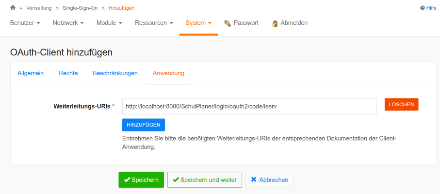Zum Schluss muss im Abschnitt Anwendung noch die Weiterleitungs-Url hinzugefügt werden. Sie entspricht der Systematik http(s)://<Server-Adresse:Port>/SchulPlaner/login/oauth2/code/iserv. Wobei Server-Adresse und Port durch die tatsächlichen Werte der jeweiligen Installation vom Franzplan ersetzt werden müssen.