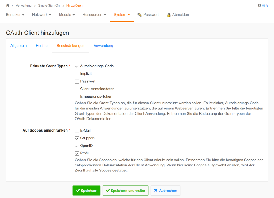 Im Abschnitt Beschränkungen klicken Sie bei Erlaubte Grant-Typen die Checkbox für Autorisierungs-Code und bei Auf Scopes einschränken wählen Sie die Checkboxen für Gruppen OpenID und Profil aus. Beispiel:
