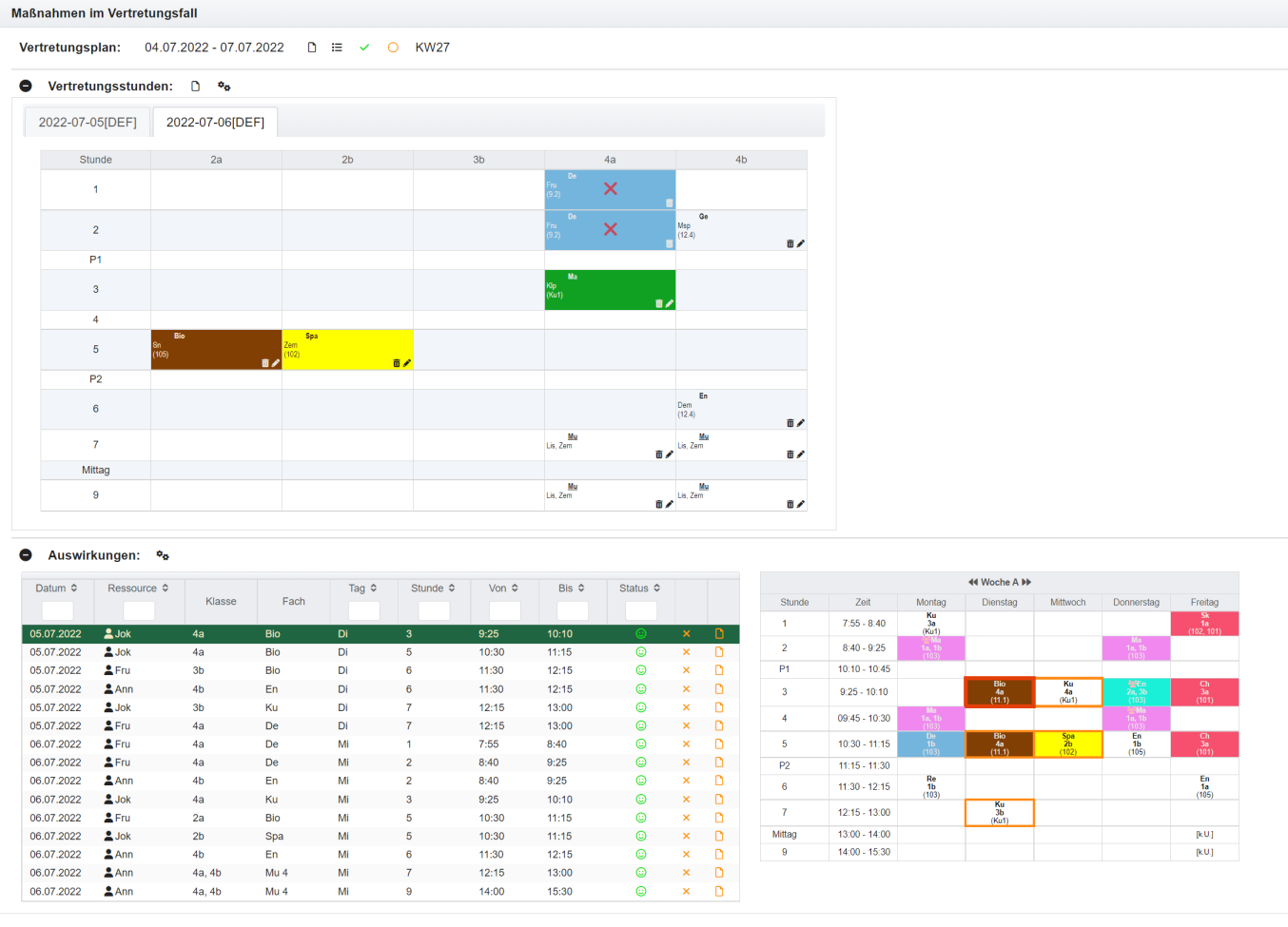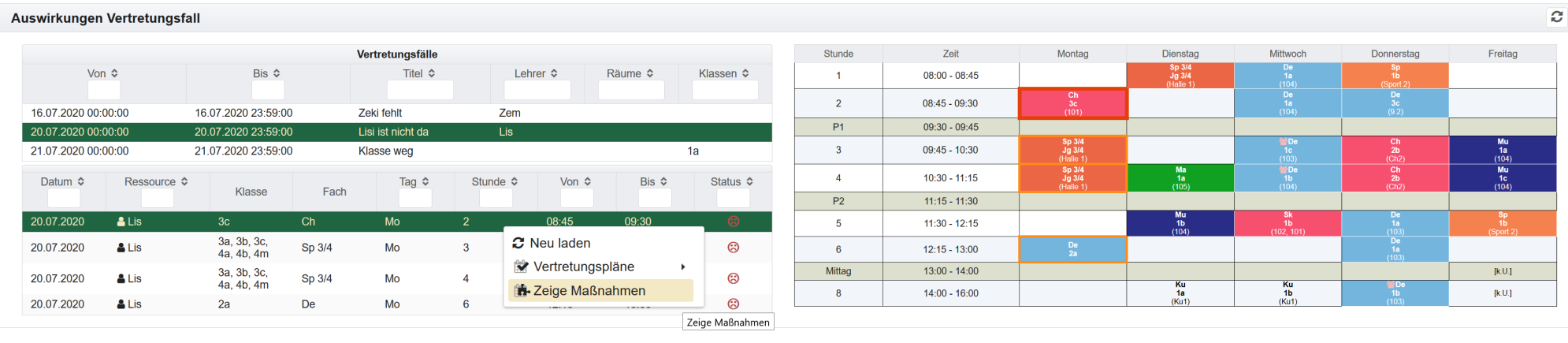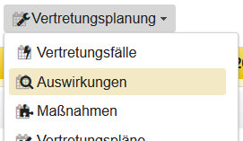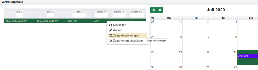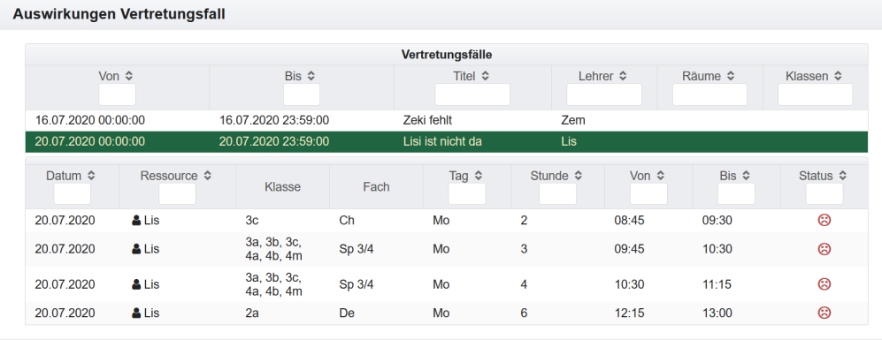 Um die Auswirkungen eines Vertretungsfalles anzuzeigen, kann man den Vertretungsfall im Menü Vertretungsplanung - Vertretungsfälle auswählen oder direkt in dieser Ansicht markieren.