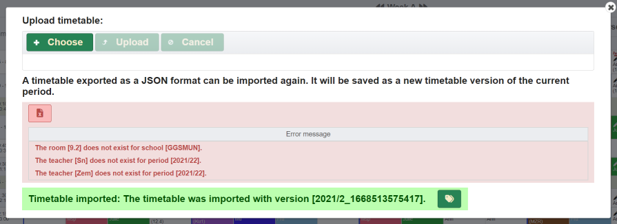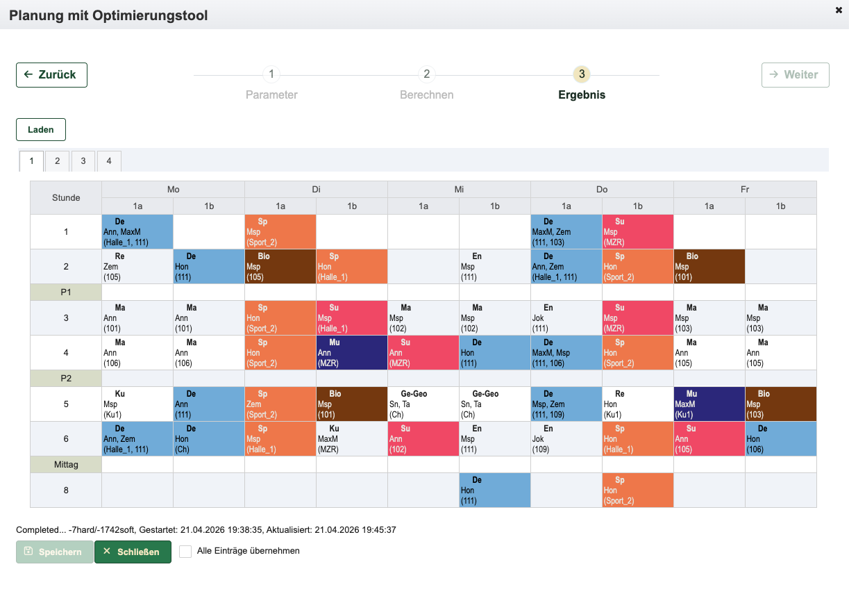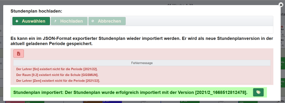 Aus der Planungsansicht kann der Stundenplan für alle Klassen exportiert werden. Erzeugt wird ein JSON-Format.