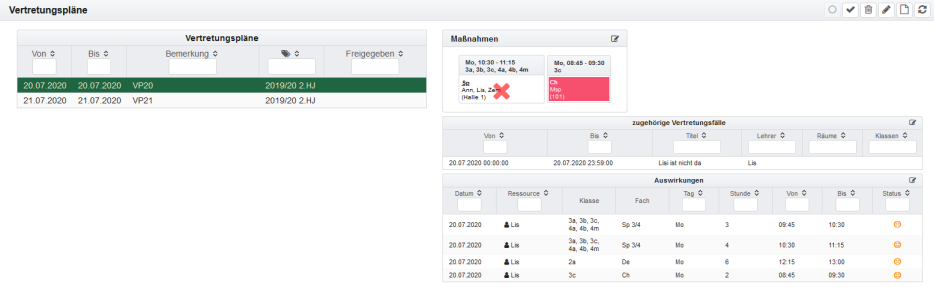 Letztendlich erfolgt die Anzeige der Vertretungsplanung auf Basis von freigegebenen Vertretungsplänen. Diese können in dieser Ansicht angezeigt und freigegeben werden. Dazu wird der entsprechende Eintrag in der Liste der Vertretungspläne markiert.