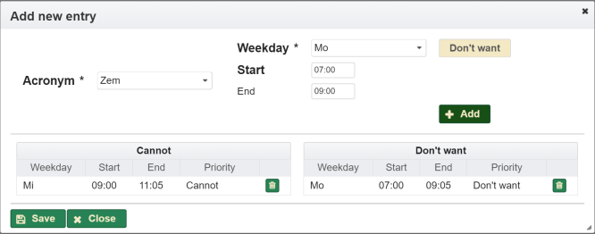 Stundenpläne der Benutzer-Dialog aufgerufen.